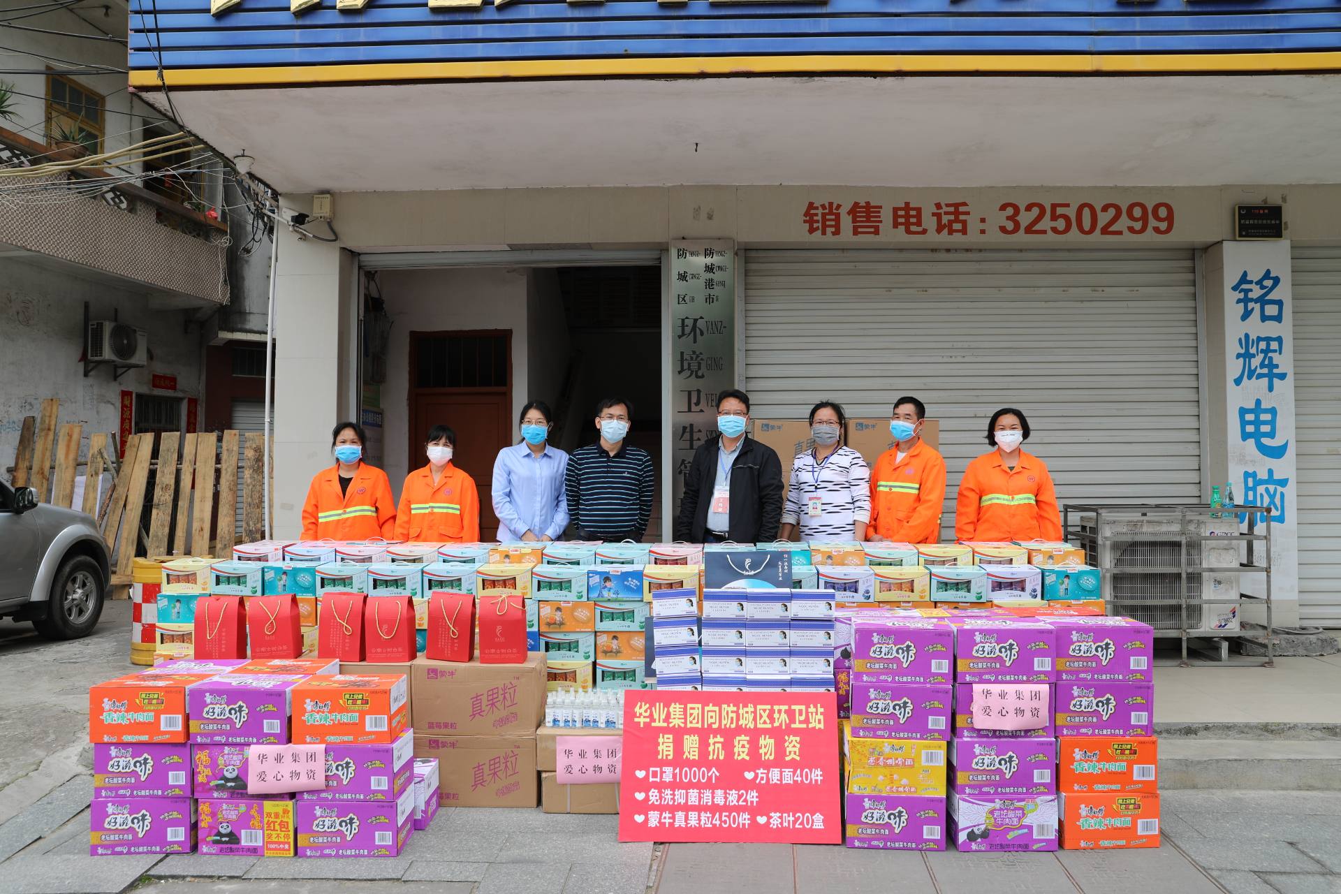 廖人興副總裁、鐘麗霞主席代表華業(yè)集團(tuán)向防城區(qū)環(huán)衛(wèi)站捐贈防疫物資