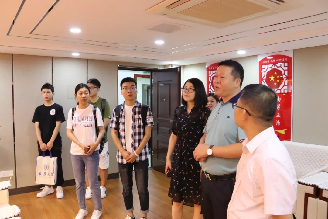 2019年7月15日,天津大學(xué)管理與經(jīng)濟(jì)學(xué)部暑期實踐隊一行在廣西校友會執(zhí)行秘書長蘇吉的帶領(lǐng)下,深入華業(yè)集團(tuán)考察交流。集團(tuán)副總經(jīng)理莫驊,辦公室、人力資源部等部門負(fù)責(zé)人全程陪同。
