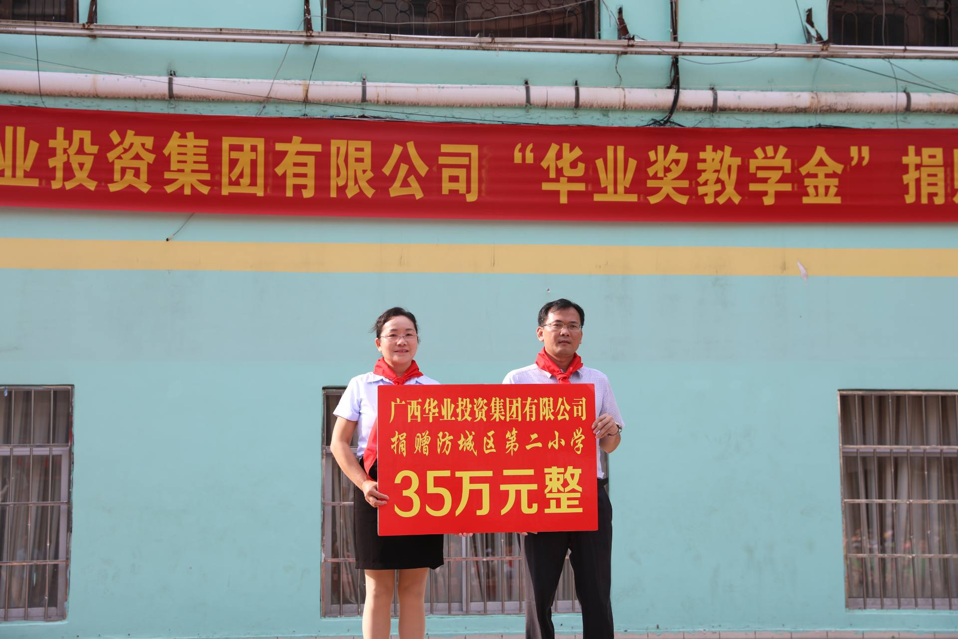 廖人興副總裁代表華業(yè)集團(tuán)向防城區(qū)第二小學(xué)捐贈獎教學(xué)金35萬元