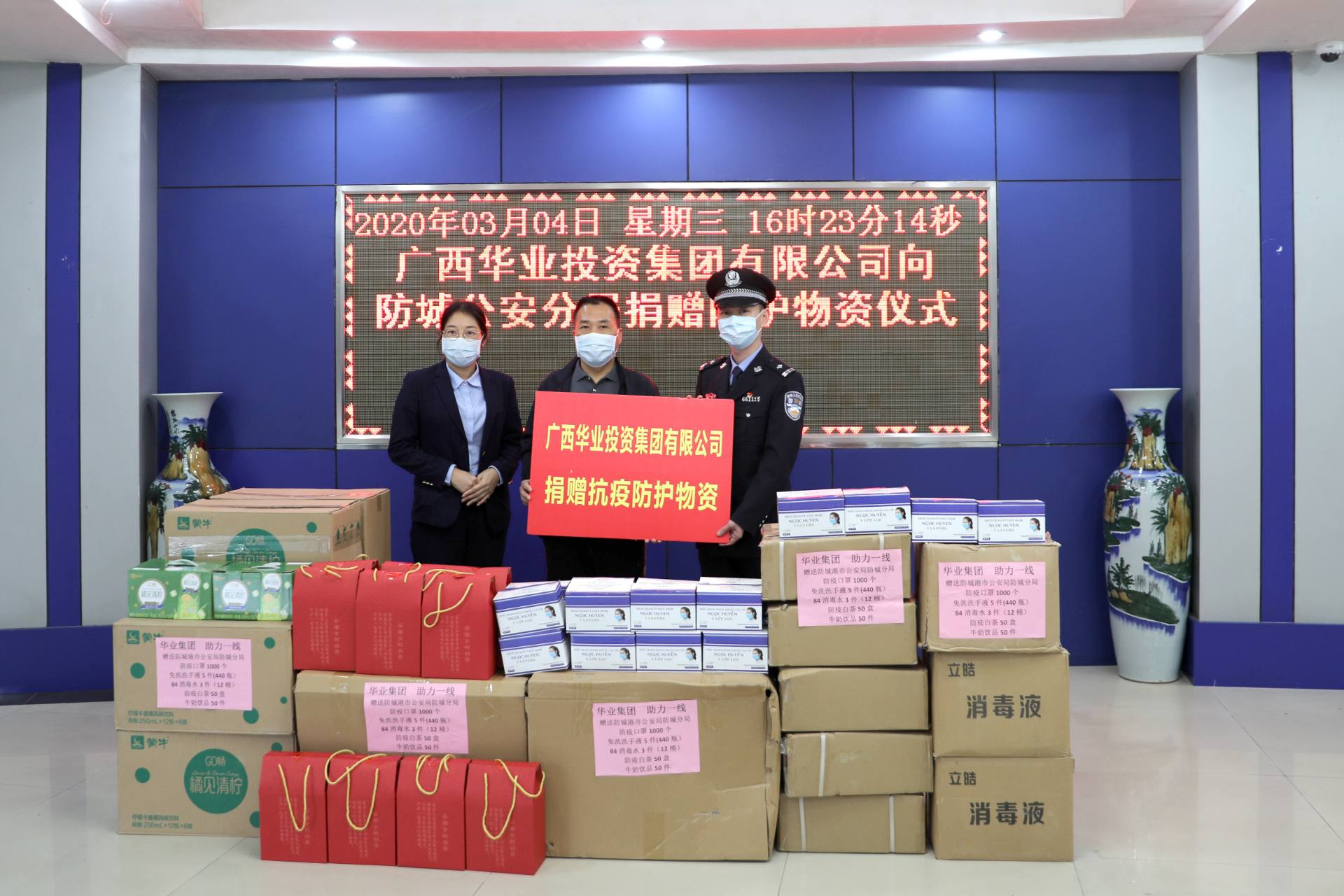 龍其偉總裁、鐘麗霞主席代表華業(yè)集團(tuán)向防城公安分局捐贈抗疫防護(hù)物資